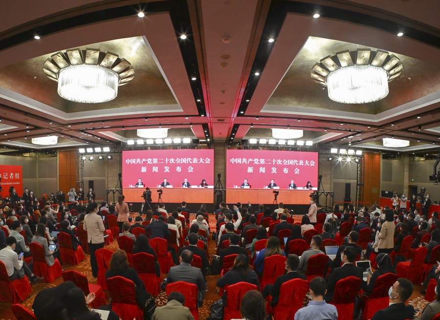 Journalists attend a press conference held by Sun Yeli,spokesperson for the 20th National Congress of the Communist Party of China,via video link in Beijing,capital of China,Oct.15,2022.(Xinhua/Chen Yehua)