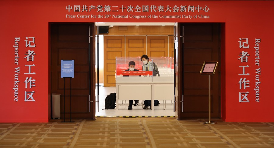 Photo taken on Oct.12,2022 shows the reporter workspace of the press center for the 20th National Congress of the Communist Party of China in Beijing,capital of China.(Xinhua/Yin Gang)