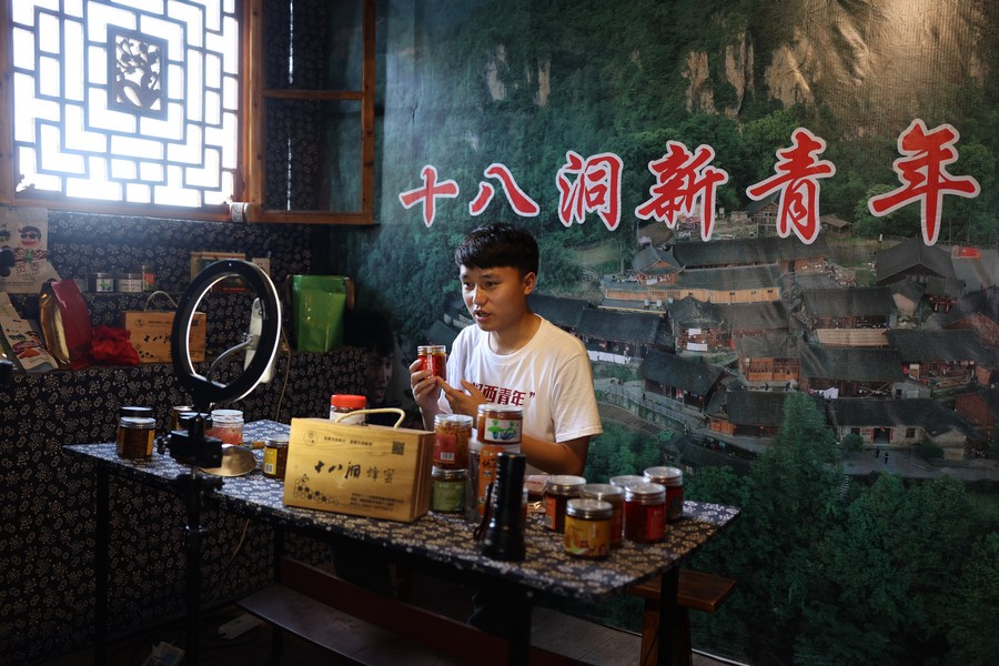 Villager Shi Kang promotes village produce on a livestream in Shibadong Village in Xiangxi Tujia and Miao Autonomous Prefecture,central China\'s Hunan Province,July 2,2022.(Xinhua/Xue Yuge)