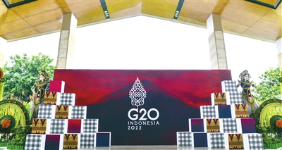 2022年11月11日在印度尼西亚巴厘岛拍摄的峰会一处会场外的峰会标识和装饰。新华社发