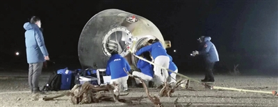随着“砰”的一声巨响,耀眼的橘黄色火焰从飞船返回舱底部喷薄而出,缓冲发动机点火成功,返回舱稳稳降落在戈壁滩上。
