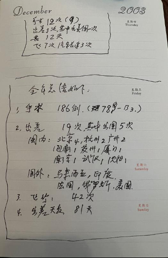 吴孟超在日记中记下的全年工作量总结。新华社记者袁全摄