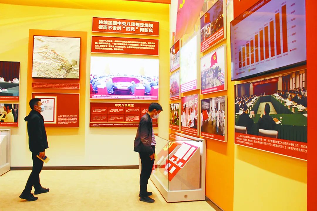 全面从严治党是新时代党的自我革命的伟大实践,开辟了百年大党自我革命的新境界。图为观众在“奋进新时代”主题成就展“全面从严治党保持党的生机活力”展区参观。本网记者赵林摄