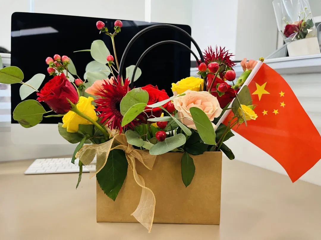 活动中,花艺老师分别讲解了花材辨识、色彩搭配、枝叶整理、插花技巧、鲜花养护等知识。大家积极构思插花立意,把玫瑰、康乃馨等鲜花精心修剪、搭配,在老师的指导下开始创作。最后,大家将鲜艳的五星红旗插在花丛中,完成了自己的作品,诠释着自己对祖国的热爱之情和美好祝福。