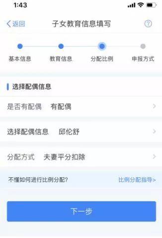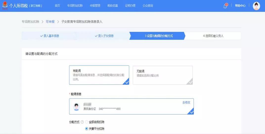 有配偶(填写真实配偶信息,并选择跟配偶的扣除分配比例)或无配偶(请据实选择分配比例)